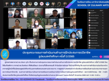 ผู้ช่วยศาสตราจารย์ ดร.ณัชนก นุกิจ เป็นประธานการประชุมคณะกรรมการดำเนินงานด้านการฝึกประสบการณ์วิชาชีพ รูปแบบสหกิจศึกษา ครั้งที่ 2/2565 โดยได้รับเกียรติจาก อาจารย์ ดร.จันทร์จนา ศิริพันธ์วัฒนา ประธานที่ปรึกษาคณบดี เข้าร่วมในการประชุม ซึ่งมีวาระที่สำคัญ คือ แนวทางการดำเนินงานร่วมกันระหว่างอาจารย์ผู้มีหน้าที่รับผิดชอบดูแลนักศึกษากับบุคลากรตัวแทนของสถานประกอบการ การดูแลความสัมพันธ์ระหว่างโรงเรียนการเรือนกับสถานประกอบการภายนอกและภายในมหาวิทยาลัย แนวทางการดำเนินงานโครงการการเตรียมความพร้อมการจัดการเรียนการสอนรูปแบบสหกิจศึกษา และการจัดกิจกรรม KM การฝึกประสบการณ์วิชาชีพ รูปแบบสหกิจศึกษา ซึ่งจัดประชุมในรูปแบบออนไลน์ ผ่านระบบ Microsoft Teams เมื่อวันที่ 18 เมษายน 2565 เวลา 12.00-13.00 น.